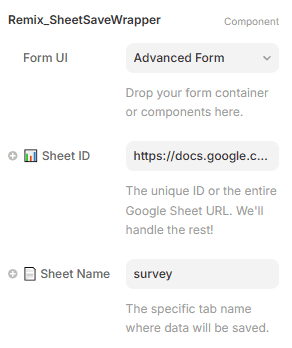 Open your Google Sheet and copy the Spreadsheet ID from the URL. Select the Remix_SheetWrapper in Framer and paste the ID into the property panel.